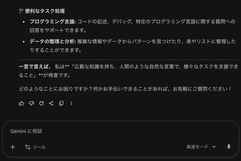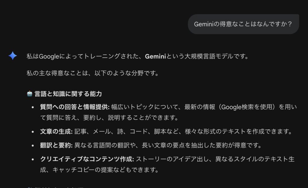 上記のリンクに飛んで「Geminiの得意なことはなんですか?」と質問すると下記の画像のようになります。簡単に使えるのでぜひ触ってみましょう。