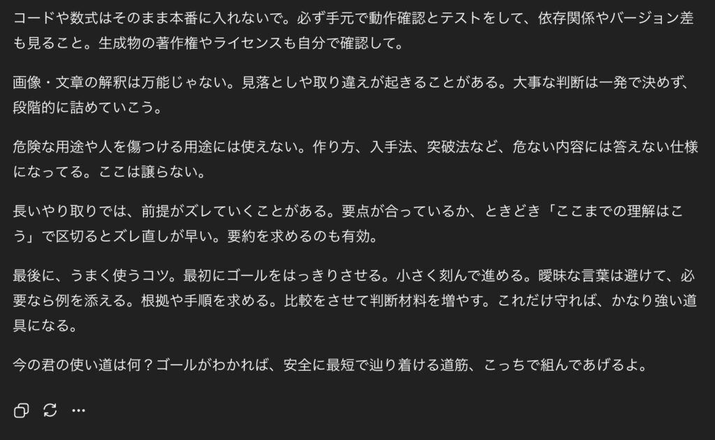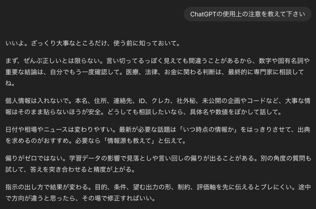 身も蓋も無くなりますが、「ChatGPTの使用上の注意を教えて下さい」とChatGPTに聞けばさらに詳しく返答してくれます。